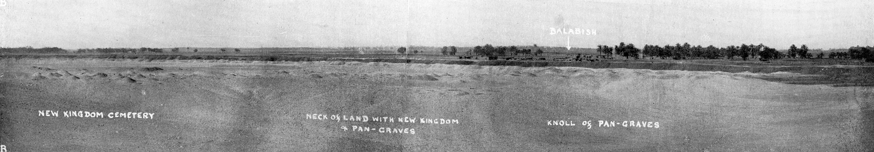 The cemeteries are located behind the most southern village in the district which is known as Balabish on a triangular ridge adjacent to a wadi. The densely packed New Kingdom cemetery is not separated from the southern most pan-graves but has been heavily looted. To the north of this cemetery, is a Coptic burial site which includes rock-cut tombs which had also been plundered in antiquity. The pan-grave cemetery was untouched and adjacent to the New Kingdom cemetery.