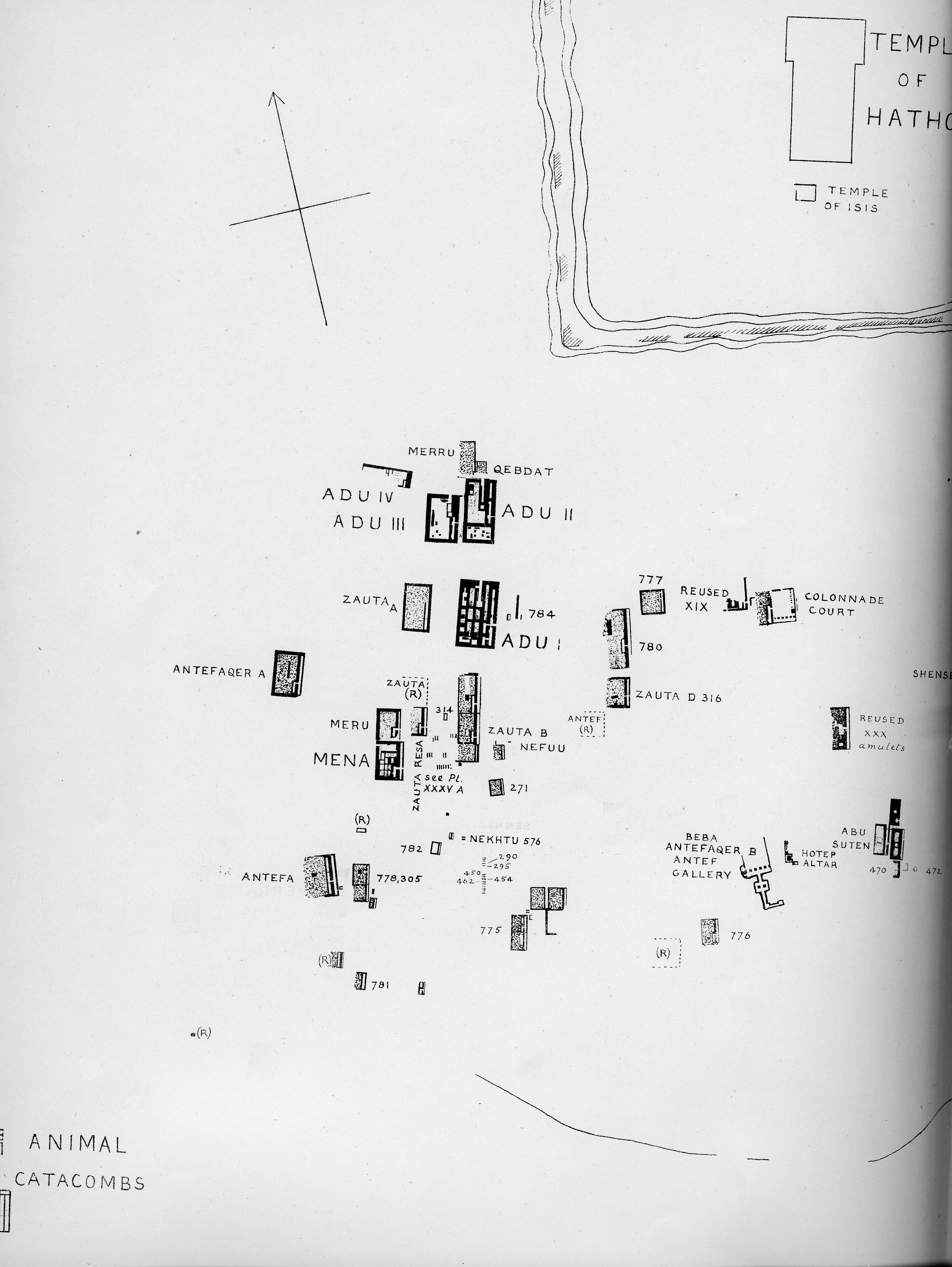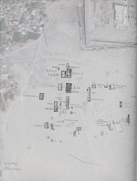 Temple (Late Period-Graeco-Roman Period); town (Roman Period); tombs (Early Dynastic Period); mastabas (Old Kingdom, First Intermediate Period); cemeteries (New Kingdom, Graeco-Roman Period) animal necropolis (Late Period-Graeco-Roman Period)